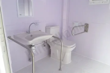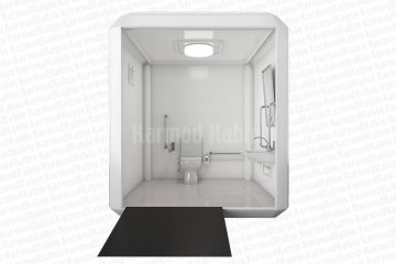 Engelli WC kabinine özel rampası ve geniş kapısından engelli aracı çok kolay tuvalet içerisine girebiliyor. Engelli standartlarında özel tutmaçlar ve ünite ekipmanlarıyla engelli tuvalet kabini engelliler için çok konforlu.