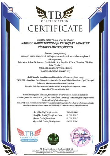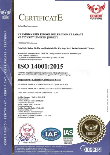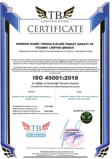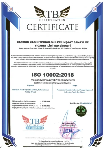 Karmod Kabin Uluslararası ISO Kalite Standartlarında üretim gerçekleştirmektedir. Bünyesindeki kalite kontrol ekipleriyle üretimlerini sistematik denetleyerek yüksek müşteri memnuniyetini hedeflemektedir.